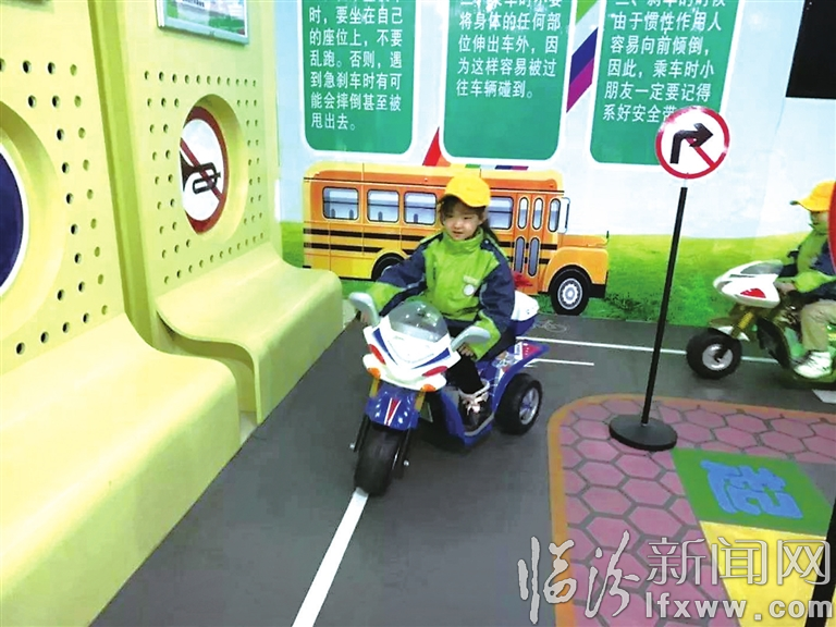 圖為在兒童體驗區(qū),小朋友們親身體驗按照紅綠燈的指示安全通過十字路口等模擬活動。