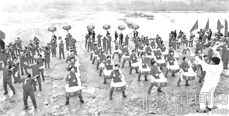 連日來,吉縣黃河壺口瀑布風景區組織百人威風鑼鼓隊在景區為游客表演,歡快、粗獷、豪放、熱情的威風鑼鼓與瀑布的濤聲交織在一起,氣勢雄壯,吸引了眾多游客駐足觀看。圖為鑼鼓隊在吉縣黃河壺口瀑布景區為游客表演。