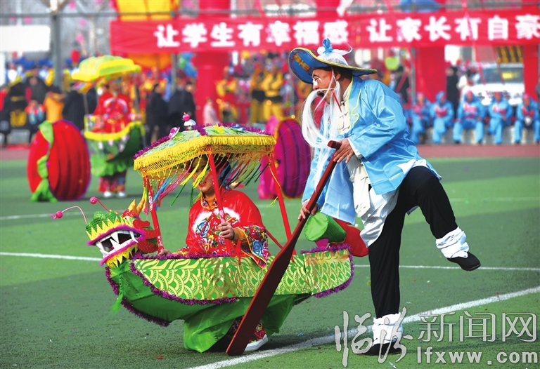 初中部150名學生組成的表演隊伍,紅裝艷裹,舞步輕盈,以《鞭花打春》把霸王鞭這種流傳于我省境內的民間舞蹈形式奉獻給了現場觀眾;初中一部50余名學生帶來的《躍馬催春》則再現了竹馬這種風行于我省城鄉的傳統民俗活動形式;初中二部一年級500名學生的秧歌《錦繡舞春》和二年級300名學生的云龍花鼓《花鼓迎春》輪番登場,同樣好不熱鬧。