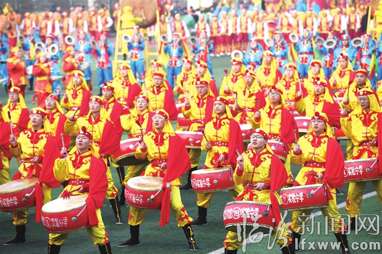 “春”是新春社火不變的主題。圓夢一部大風鑼鼓隊率先登場,500名高二年級學生表演的《金鼓擂春》,威風凜凜,有板有眼。這支鑼鼓隊組建于2014年年底,演奏曲牌出自土門威風鑼鼓,經相關專業人士全面整合,融入當今鑼鼓發展趨向要求,從而形成了風格獨特的同盛實驗中學大風鑼鼓曲牌。