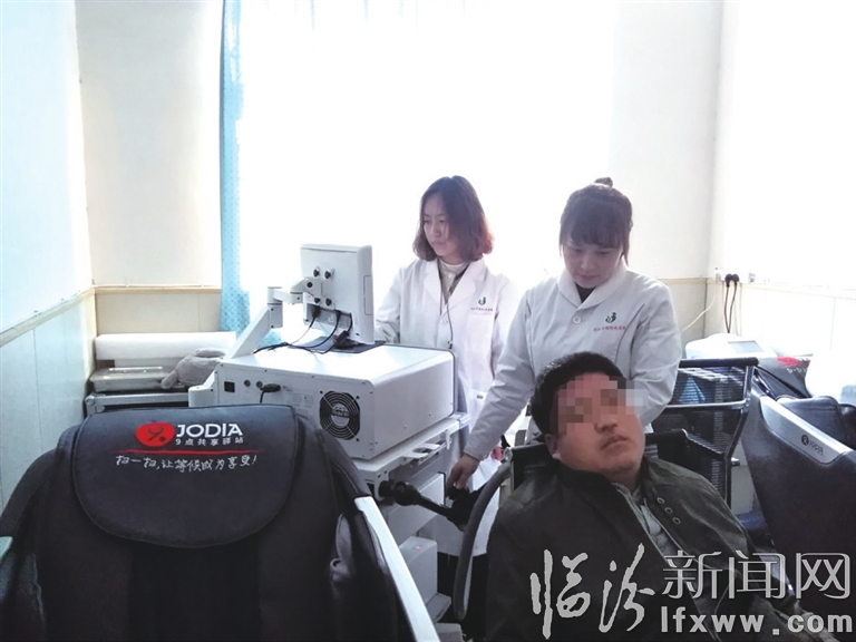 懷著忐忑不安的心情走進經(jīng)顱磁刺激治療室,醫(yī)務人員單麗娜和侯建正在給二娃做治療,坐在治療椅上,31歲的二娃很安靜,不像傳說中的患者那樣狂躁不安。經(jīng)顱磁刺激治療室的墻上掛著一面錦旗“醫(yī)術精湛,精心呵護”,是患者付女士元月份剛給送來的。看見我們進來,老馮站起來說:“還沒出正月,二娃父子仨全病了,他爸和大娃在痔瘺醫(yī)院住著,二娃住這里,我不招呼誰招呼,他和他哥都是我看著長大的。我也不知道這二娃的命是好還是不好,說他好吧,生下一歲多點媽就去世了,和哥哥父親相依為命。說他不好吧,二娃又趕上了好政策,二娃在這里治療,一切都是免費的。”