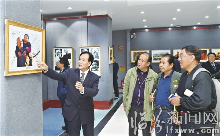 圖為楊來斌(左)在市群藝館展廳和影友交流攝影作品創(chuàng)作心得。
