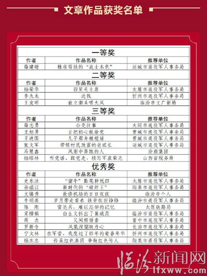 臨汾新聞網(wǎng)訊 4月14日,山西省“老兵永遠(yuǎn)跟黨走?傳承紅色基因,續(xù)寫軍旅榮光”作品征集獲獎名單公布,中國散文學(xué)會會員、山西省作家協(xié)會會員、天津散文研究會理事、河北省散文學(xué)會會員、臨汾市作家協(xié)會名譽(yù)副主席、臨西縣散文學(xué)會名譽(yù)會長、臨汾市文旅局退休干部王友明的紀(jì)實作品《敢立潮頭唱大風(fēng)》,榮獲文章類二等獎。