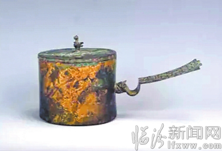在臨汾博物館陳展的這件銅熨斗出土于隰縣瓦窯坡遺址,時代為春秋中期。整件器物長23.8厘米、高12厘米、口徑11.4厘米。平蓋,蓋為母口,蓋鈕為一只張開翅膀站立的小鳥。斗身為圓筒形。斗柄前端窄后端寬,前端由獸首與器身相連。器蓋以及器身滿飾細如毫發的線刻紋,外壁三組線刻紋上下對稱,分別是小三角紋,勾連紋,中央帶小卷須的大三角紋。內壁均勻地分布著四條首尾相對的魚形線刻紋飾,柄部是相互纏繞的鏤空夔龍紋。