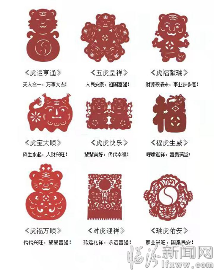 《虎福獻瑞》系列剪紙,包含《虎運亨通》《五虎呈祥》《虎福獻瑞》《虎寶大順》《虎虎快樂》《?;⑸贰痘⒏Hf順》《對虎迎祥》《瑞虎佑安》等多幅作品。
