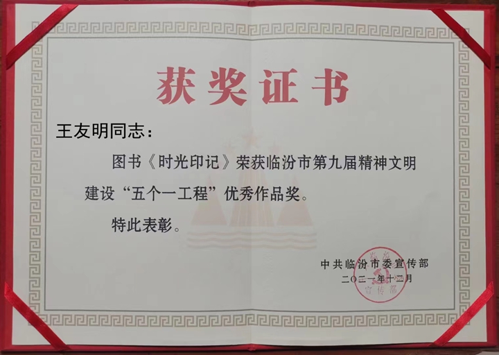2021年12月24日,臨汾市舉行了以“永遠跟黨走”為主題的第九屆精神文明建設“五個一工程”表彰展演活動,對63件優秀作品進行了表彰,王友明的散文集《時光印記》榮獲優秀作品獎。日前,《神州文學》雜志社“年度優秀圖書名單”新鮮出爐,他的散文集《時光印記》榜上有名。王友明為臨汾文化事業煥發出新的活力,做出了積極的貢獻!(孫鵬、王登博)