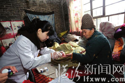 上午10時許,在村民張西鳳的家中,行動不便的她一見到志愿者的到來,激動地握著我們的手,連連示意我們坐上炕頭。在醫生叮囑她飲食方面需要注意的事項時,她頻頻點頭,醫生還對她提出的問題進行了解答;當記者表示會為她免費拍攝照片時,她更是不住地說著感謝的話。