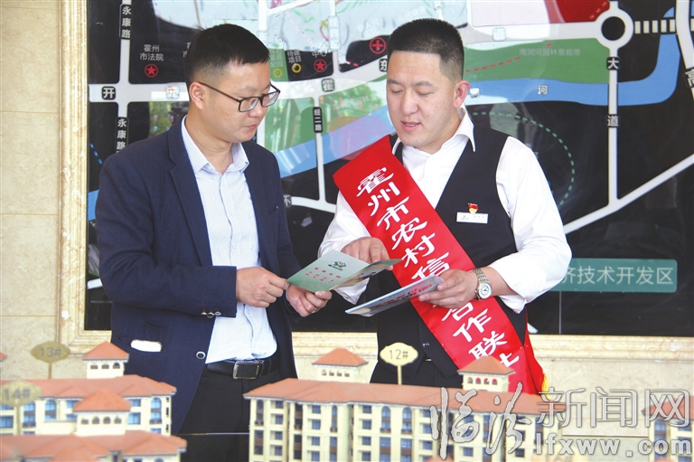 近日,霍州聯社營業部通過“網格化”摸排、“保姆式”服務,以陽光首府為試點,構建“陽光”信用示范市場。圖為工作人員為市民講解貸款政策。