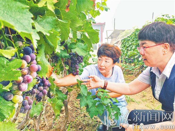 臨汾新聞網訊 “北席葡萄”久負盛名,為助力農戶更好地發展葡萄種植,堯都農商銀行賈得支行做好入戶調查,第一時間為他們提供金融服務。圖為近日工作人員與農戶一起查看葡萄長勢。