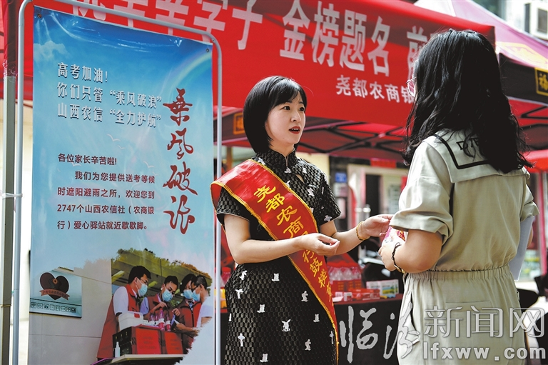 臨汾新聞網訊 高考期間,堯都農商行在市區考點搭建“愛心助考”服務站,為高考學子和家長提供服務和幫助,并送上最真摯的祝福和期盼。圖為工作人員向考生送上學習用品。