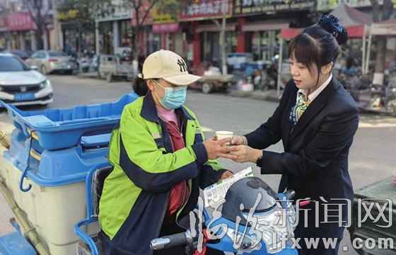臨汾新聞網訊 進入初冬時節,隰縣農商行工會大力開展“暖冬”行動,通過為群眾遞上一杯熱水、攙扶老年客戶上下臺階、為有需要的路人提供幫助等,向社會各界傳遞溫暖,詮釋農商行為民服務的初心使命。圖為工作人員向環衛工人送上熱水。
