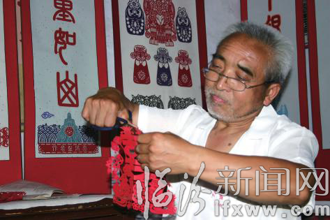 張滿喜生于1943年,他說,是黨把他從一個一字不識的農家娃培養成一名合格的國家干部的。從工作崗位上退下來后,剛開始也覺得閑得慌,他的妻子張素梅是個心靈手巧的人,常常愛用剪刀剪個窗花什么的,看著妻子手里翻飛的剪刀,張滿喜忽然靈機一動,萌生了一個思路,剪一些剪紙作品,抒發對黨的熱愛。張滿喜說,盡管自己從小就喜歡剪紙,有一些基礎,但要真拿起剪刀來設計作品,可不像想象得那么簡單。為了剪出滿意的作品來,他經常去古城鎮孟家莊找剪紙能手趙國璽請教。趙國璽的父親趙俊杰年輕的時候在浮山,曾經點起浮山剪紙的星星之火,面對張滿喜的虛心求教,趙國璽毫無保留地給他傳授剪紙藝術。功夫不負苦心人,張滿喜終于能得心應手地駕馭剪刀了,終于能剪出自己滿意的作品了。