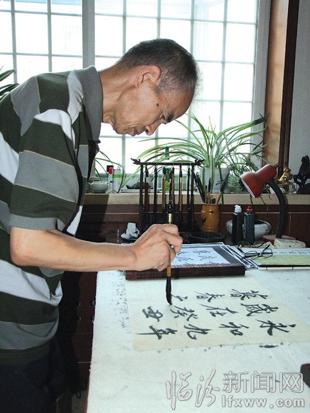 “小時候在老家稷山上小學,上課之前每個學生都要寫仿,直到小學畢業。”蘇勤義說,自己的書法功底都是小學時積累下來的,后來上初中、上高中、上大學、參加工作,都沒有放下過毛筆,但并沒有專門練習書法,直到2011年才在朋友的指導下臨習碑帖。”在蘇勤義的書桌旁堆放著不少習練完的紙張,地下室則更多,所習練字帖有《蘭亭序》《圣教序》《孫過庭書譜》《智永千字文》等,近兩三年的時間里,他積極請教書法名家,與書法愛好者交流學習,并堅持每天習練兩個小時,一年四季堅持不斷,書法習作大有長進,得到了不少書法家贊許。