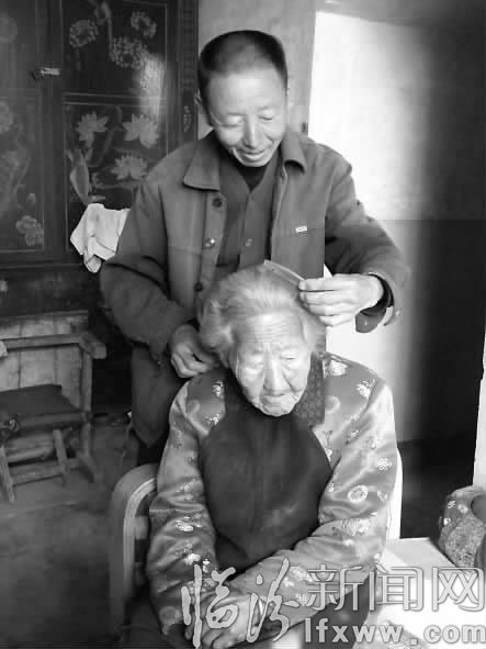 郝海民給母親梳頭。