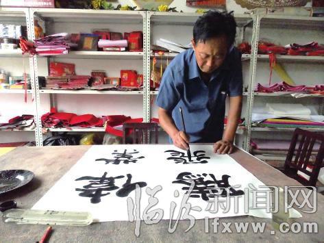 65歲的衛東福,是洪洞縣大槐樹鎮辛堡村人。現為洪洞縣老年書畫研究會會員、明姜鎮書畫研究會會長、中國老年書法家研究會員,書法作品以隸書見長,并在國內各類大賽中獲獎。近年來,他先后策劃舉辦過地方性個人書法展,并為當地機關、百姓書寫對聯不計其數,有“草根書法家”“愛心書法家”“對聯書法家”“接地氣書法家”等口碑。明姜鎮地屬丘陵山區地帶,村民居住較為分散,交通也相對閉塞,凡是鎮上村民,只要家中有紅白喜事,都要去找衛東福寫對聯,他在鎮上經營的一家書法門市部成了方圓村民常來常往的地方。一些文化素養較高的村民,對對聯的書寫要求會更高一些,這也給衛東福帶來一定的壓力,有村民調侃地說:“沒有好人寫就怕有好人看。”而對于一些不識字的農民朋友,衛東福要求自己把握好對聯的內容要通俗易懂。衛東福認為,隸書之所以被老百姓認可,是因為隸書講究一破三折,秀美厚重,不管是筆法或內容出現瑕疵,老百姓一看就懂,隸書最大眾化、平民化易被接受,這也是他選擇用隸書服務老百姓的主要原因。