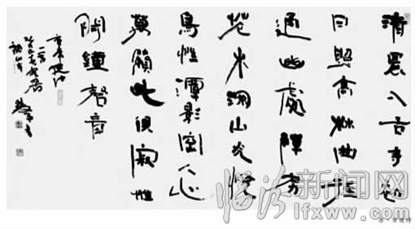 賈雙平遍臨經典法帖,將著力點落在了草書與隸書上,師法于自然,并注入了自己的心源發(fā)現,開辟屬于自己的“個人色彩”。其草書飄逸之中猶存古意,流暢而富有韻致,任筆端馳騁于古今往昔,游弋于詩情畫意,引人注目且耐人尋味;其隸書古樸渾厚,寓清麗于雄渾之中,藏秀美于宏壯之間,見靈氣在筆墨之外,有筆力千鈞之感,穩(wěn)重雅逸之氣。