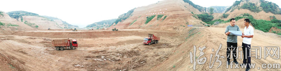 北掌水庫為中部引黃工程,位于汾西縣對竹鎮北掌村南掌河,工程建成后,可為汾西縣解決農業灌溉問題。圖為蔡源龍與村委主任李耀紅查看北掌水庫的工程進度。