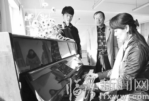 冬日的臨汾,陽光從一扇窗戶照進房間內,將溫暖投射到一架黑色鋼琴上,在靜謐的房間里,悠揚、悅耳的音樂回蕩期間。鋼琴旁,一位中年女士在彈奏著鋼琴,手指在黑白琴鍵間上下翻飛,在她的身旁,一位中年男子手拿幾張樂譜打著拍子,一旁的年輕男生深情地唱著歌。