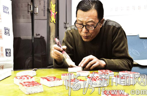 胡志平今年67歲,自1999年從洪洞縣經委退休后,出于對傳統雕刻技藝的喜愛,十幾年如一日沉浸在雕刻印章的研究之中。“我一直都非常喜歡印章文化,中國的印章傳承千年,文化底蘊非常深厚,不同材質的印章有著不同的制作講究,我剛開始只是喜歡收藏,后來就直接上手研究了。”胡志平告訴記者,他從沒有學過刻章,在雕刻第一枚印章前,可以說是一無所知。曾想找個人請教,可身邊也沒有人懂,只能摸著石頭過河了。