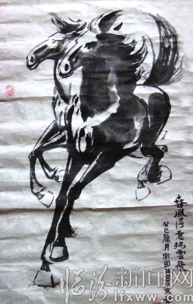 大約1988年的一天,聞訊當年的“小悲鴻”來臨汾探望恩師尹向前先生,也趕過去與之會面。閑話間,知道衛國珍畫馬的技藝大有長進,她對馬的研究幾乎到了如醉如癡的地步,早在1979年就認真研究徐悲鴻的畫馬技法。對于馬的一縱一弛、一動一靜,風中雨里的情態,骨骼肌肉、鬃毛馬尾的變化,都做了快速的勾畫;從公園里供游客玩賞的溫順的馬,到草原上奔馳縱橫的烈馬,她都進行了細微的觀察。臨摹韓干的靜馬,再到臨摹徐悲鴻的動馬,努力揣摩、體悟悲鴻馬的情韻、神姿,以致把天上的云、水里的影都常常看做是“馬”,真可謂“遷想妙得”,移情”于馬,步步深入地領悟、繼承了徐悲鴻畫派的一些風格,畫出了“衛氏馬”。后來,她畫的《萬馬奔騰圖》在《中國青年報》《中國教育報》《中國婦女報》多有發表。