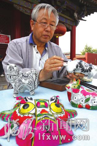9月23日,記者在堯廟廣場上偶遇一位老人,只見他瞇著眼睛,毛筆正在一塊泥塑上勾勒著,不出幾分鐘,惟妙惟惟的彩繪泥牛就出現在記者面前。