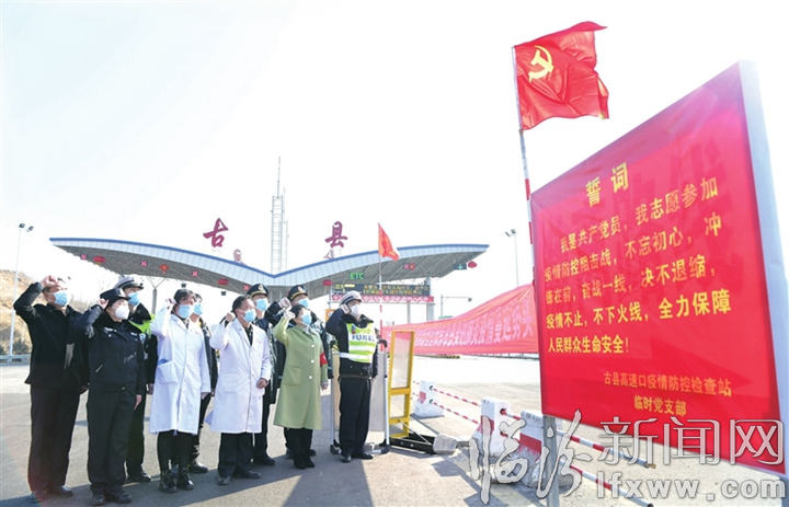 2月12日,在長臨高速口古縣監(jiān)測點(diǎn),鎮(zhèn)村干部、交通、交警、衛(wèi)生一線人員高舉右拳,面對鮮紅的黨旗莊嚴(yán)宣誓。讓黨旗在“抗疫”前線迎風(fēng)招展,讓黨徽在“抗疫”一線閃閃發(fā)光。