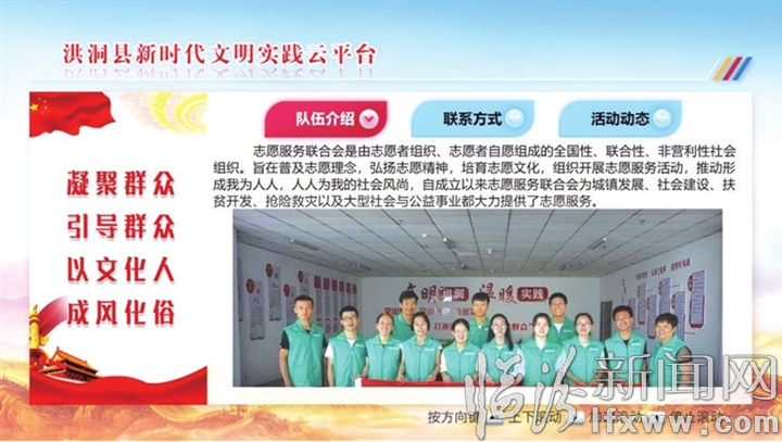 該縣打造了文化輔導云視訊培訓平臺、智慧洪洞手機移動平臺、新時代文明實踐云平臺線上三大網絡平臺和理論宣講、教育服務、文化服務、科技科普、體育健身五大線下平臺,努力做到了哪里有群眾需求,哪里就有志愿服務。