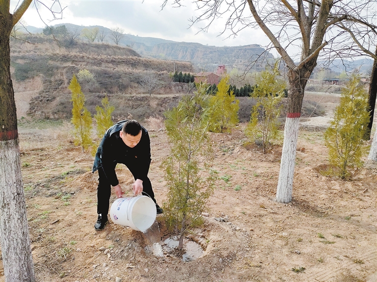 春暖花開芳草綠,植樹造林正當時。汾西縣對竹鎮北掌村村委會購買了100余棵側柏,組織村干部、駐村工作人員、貧困戶在村口及村間道路兩側種下樹苗,綠化美化村容村貌。圖為北掌村第一書記兼黨派組織書記蔡源龍在為樹苗澆水。