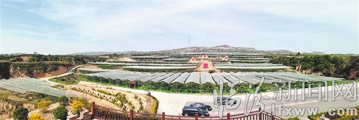 攀上乾坤灣鄉境內的蘋果標準化生產示范基地觀景平臺,舉目遠眺,“果業興農”四個紅色大字在漫山遍野的綠色中格外顯眼。