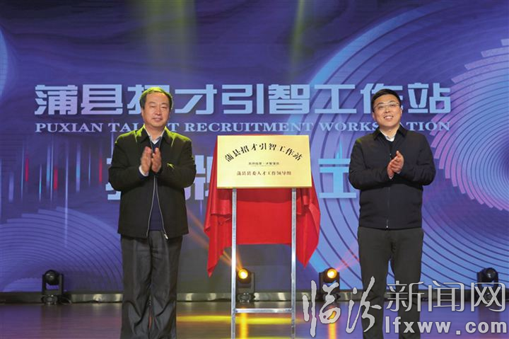蒲縣縣委常委、組織部長楊洋,山西農(nóng)業(yè)大學(xué)學(xué)生工作部部長原廣華為“蒲縣招才引智工作站”揭牌