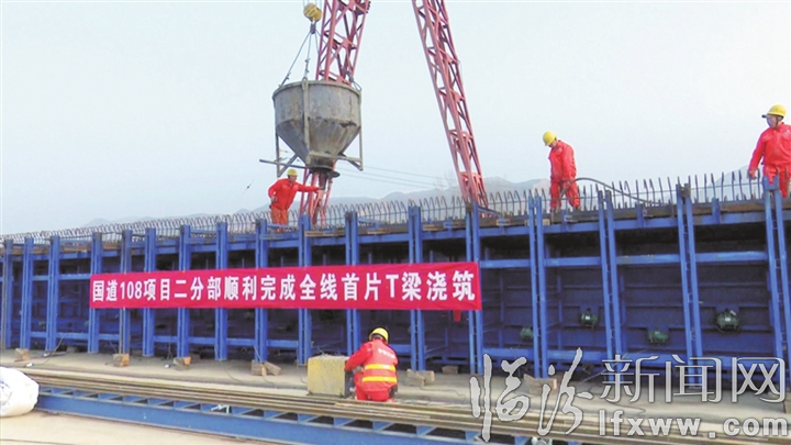 2月14日下午,隨著混凝土運輸車到位、料斗起吊,國道108全線首片T梁開始澆筑,這標志著國道108改線工程侯馬段預制梁場全面投產,為完成年度目標任務打下堅實基礎。
