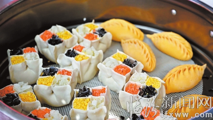 這其中,浮山燒麥可謂是獨占鰲頭。其最早形成于唐、宋,興盛于明清。乾隆帝御筆賜匾“都一處”,使浮山燒麥名揚四海、享譽八方。現場,只見廚師們手拿燒麥錘,使用巧勁兒來回搟壓面皮,將燒麥皮搟出褶,再分層撒上面粉防止粘連,最后用燒麥錘輕輕一搓,一張張薄如蟬翼的燒麥皮就小巧出爐,像極了一朵朵盛開的牡丹花。接下來,廚師們將提前調制好的鮮肉餡料包裹其中,上蒸屜,只需5分鐘,即可出鍋。那一刻,蒸熟的燒麥,頂部的24褶像極了麥穗,下面皮薄透餡,紅白相間。沾點醋,來上一口,餡大汁多,咸香十足。“好看、好吃、好過癮!”游客王平對浮山燒麥贊不絕口,“早有耳聞,今日一吃,名不虛傳。”