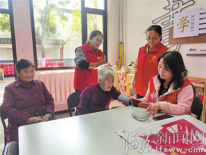 段村社工站社工給老人量血壓。記者 李衛紅 攝