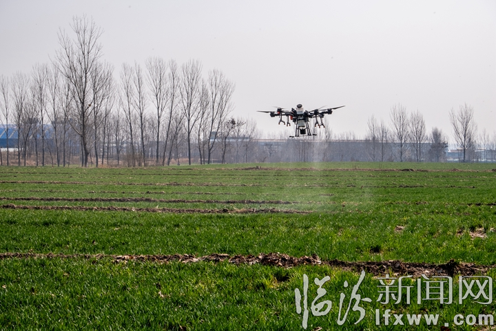 綠油油的麥田里,一名技術員手握遙控開啟植保無人機,為村里全托管麥田打藥。聽聞村里來了能干農活的飛機,三三兩兩的村民結伴趕來看“熱鬧”。