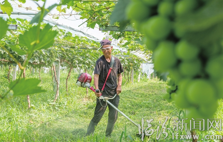 這頭除草園丁孫建國干得起勁,那頭的修剪園丁們聽得認真。原來是園區負責人祁林又“開講了”。他舉例說明:“葡萄品質與收益的對比”,陽光玫瑰葡萄是從日本引進的高端品種,果粒緊密、果肉多汁,且有濃郁的玫瑰香味,也應了“吃葡萄不吐葡萄皮”的繞口令。若在管理上粗制濫造,有一道管理跟不上,它就達不到標準商品果的要求,其價值也會從100多元/公斤跌至6元/公斤。現在,園區的陽光玫瑰葡萄以品質得贊,供不應求。這不,鮮嫩的葡萄還沒上市就有“深圳的婆家”來下聘。