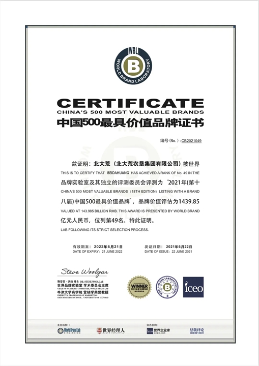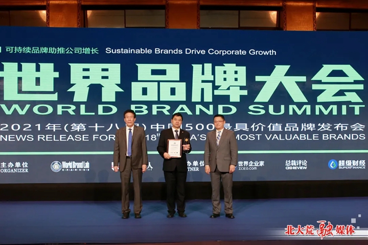 6月22日,由世界品牌實驗室主辦的2021年第十八屆世界品牌大會暨2021年度中國500最具價值品牌發布會在北京舉行。會上發布了2021年中國500最具價值品牌分析報告。北大荒農墾集團有限公司五大品牌——“北大荒”“九三”“完達山”“豐緣”“親民食品”榮登中國500最具價值品牌排行榜。“北大荒”品牌價值達1439.85億元。北大荒農墾集團有限公司黨委委員、副總經理郭寶松代表集團領取獎杯和獎牌。