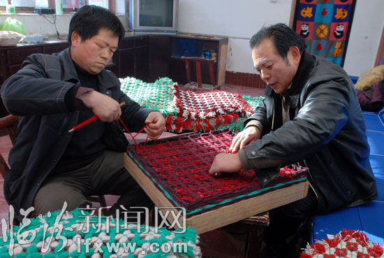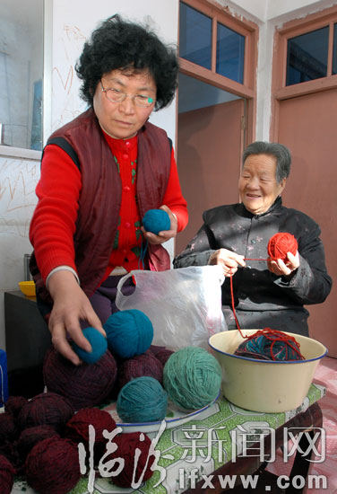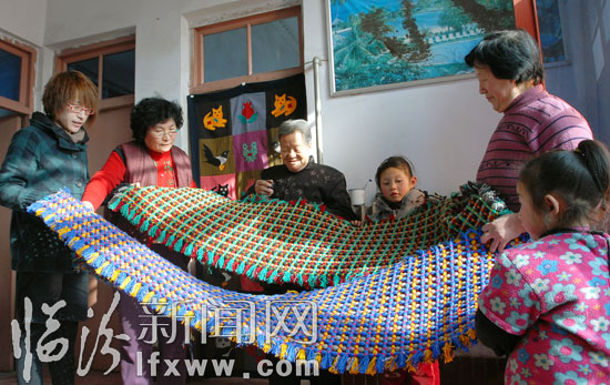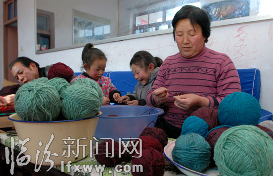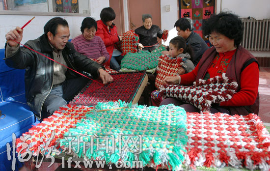 2月1日,襄汾縣新城鎮閆店村的村民正在用舊毛線編織座墊。