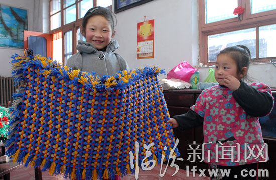 2月1日,一名小孩在展示用舊毛線編織的座墊。