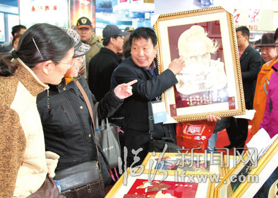 山西特色農(nóng)產(chǎn)品北京展銷周上,亢秀奎向人們展示他的作品《母親》。