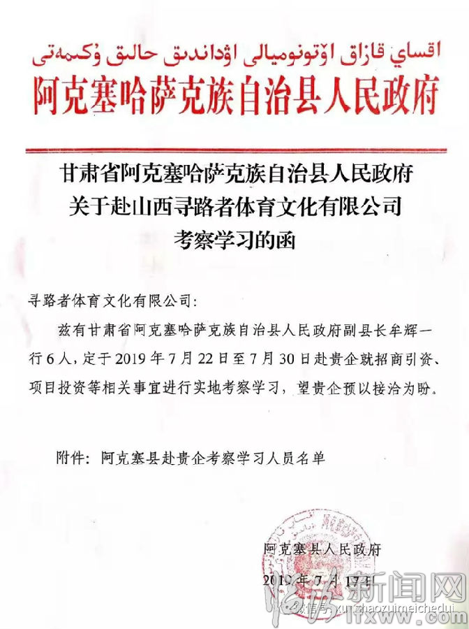 臨汾新聞網訊 2019年7月24日,阿克塞哈薩克族自治縣政府一行6人,對山西尋路者體育文化有限公司進行實地考察,在公司會議室舉行了座談交流會。會上阿克塞縣人民政府副縣長牟輝向參會人員推介阿克塞縣的發展歷史及豐富的旅游和礦產資源,隨后雙方就旅游開發,自駕營地建設等方面進行交流。臨汾市青年企業家協會秘書長王璐代表接待方對阿克塞縣政府一人到來表示熱烈的歡迎,向阿克塞縣政府介紹了臨汾市的發展歷史及優勢,并表示會積極促成雙方在旅游、礦產開發等方面的合作。在座各協會及青年企業家代表就關心的問題與阿克塞政府代表進行深入交流。會后阿克塞縣政府一行對青企協會員單位進行了考察、走訪,就招商引資事宜進行了洽談。