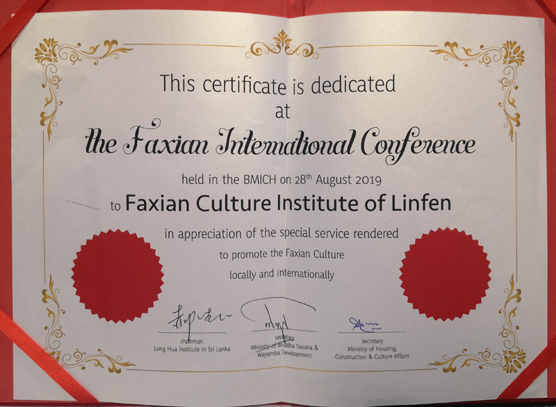 論壇組委會進行了頒獎儀式,獎勵為中斯文化交流和“一帶一路”倡議做出貢獻的組織和人士。阿努拉德普勒市政府、中國佛教協會國際部、臨汾市人民政府、北京靈光寺、無畏山寺等單位獲得“單位榮譽獎”;臨汾市法顯文化研究會賈雪梅、劉翠菊、袁維學、馮春海、釋心如、張梁等人獲得 個人榮譽——“國際法顯文化榮譽獎”。