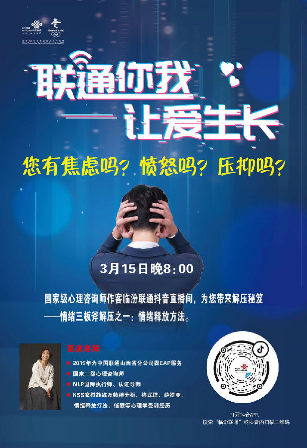 3月15日晚8:00,國家級心理咨詢師作客臨汾聯通抖音直播間,為您帶來解壓秘笈——情緒三板斧解壓之一:情緒釋放方法。