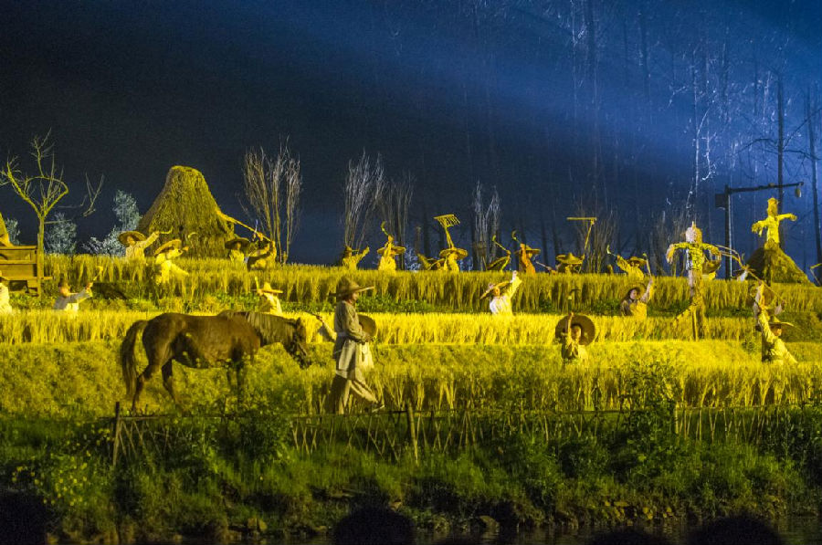 劉明祥一家就是受益代表。他和兒子是這場演出劇目里360位演職人員中的兩員,分別扮演羊倌和漁郎。劉明祥每晚在河岸上輕輕揚起鞭子,他的羊群便爭先恐后的跑到芳草鮮美的草地上吃草。而年輕的兒子一把漁網撒下去,便有肥厚的魚群爭先恐后的鉆入網內。他們扮演的是自己,因為這就是他們的日常生活。