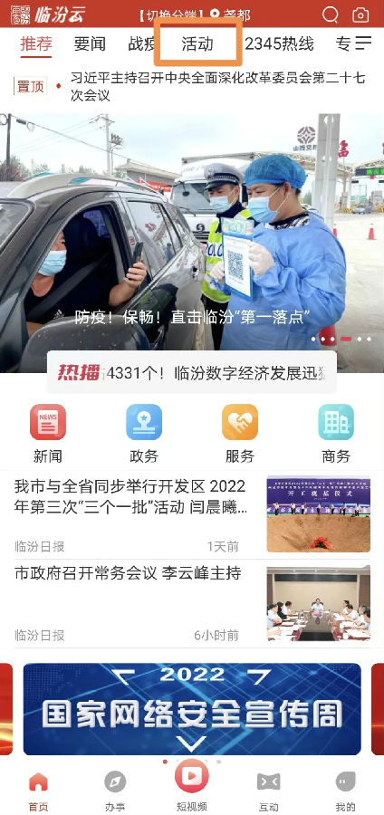 2、打開“臨汾云”APP,點擊“活動”頻道。