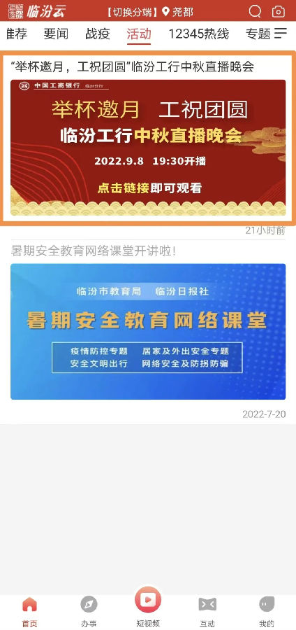 3、點擊“活動”頻道,進入活動界面,點擊“臨汾工行中秋直播晚會”鏈接即可觀看。