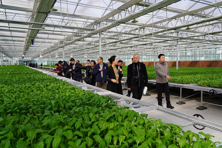 之后,記者一行來到曲沃智慧果蔬產業示范區,曲沃縣農業農村局局長謝新民向大家介紹了當地特色農業產業的發展規模、優勢,及糧果菜畜齊頭并進的高質量發展新格局。期間,記者們參觀了示范區的無土栽培蔬菜基地。望著玻璃溫室內高架上一排排鮮嫩翠綠的蔬菜,有記者感嘆:“這里的農業太發達了,難怪曲沃縣是全國580個蔬菜重點縣之一。”