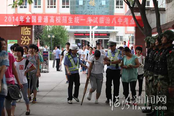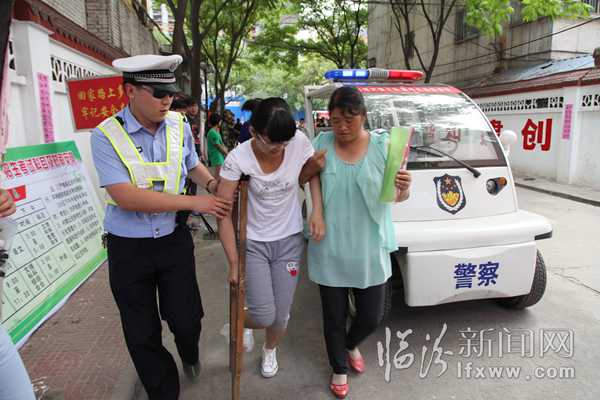 一名在八中考點參加高考的女學生考前不小心腳部摔傷,仍然帶病參加考試,北城交警大隊民警田強等發現后,馬上開警車接送其參加考試,一中隊隊長徐金生得知這一情況后,立即安排民警要在這兩天的考試期間里專人專車專門接送。 記者 趙文家 攝