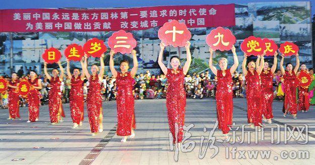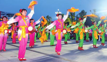 7月1日,在堯都區堯都廣場,文藝愛好者在表演舞蹈。當日,東城志愿者文化藝術團慶“七一”消夏晚會舉辦,18個社區文藝團體表演了舞蹈、歌曲以及花鼓等精彩的文藝節目,祝福黨的93歲生日。