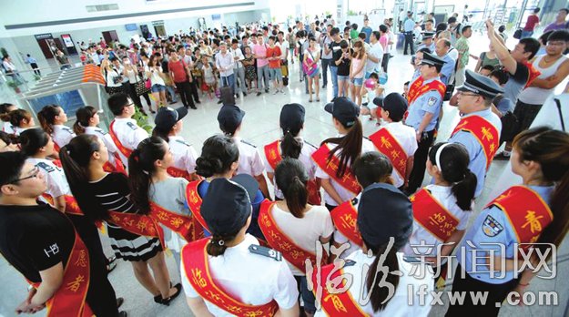 7月1日上午9時(shí)許,臨汾西站候車室內(nèi)人潮涌動(dòng)、人聲嘈雜。忽然,陣陣歌聲傳來(lái),吸引了候車旅客的目光。40余名臨汾鐵路公安處民警和山西師范大學(xué)青年志愿者帶著旅客一同唱歌,讓喧鬧的候車室瞬間變成了歌唱的舞臺(tái)。傾情的“閃唱”,為旅客送來(lái)了溫情祝福。隨后,民警和志愿者們還積極為來(lái)往旅客提供志愿服務(wù)。