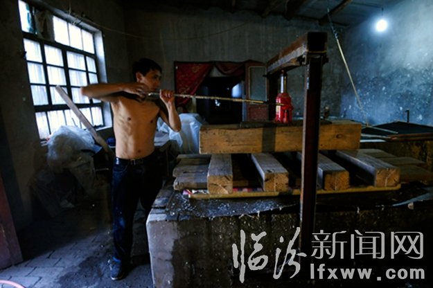 襄汾縣帝堯麻箋長的工人正在壓除紙漿中的水分。
